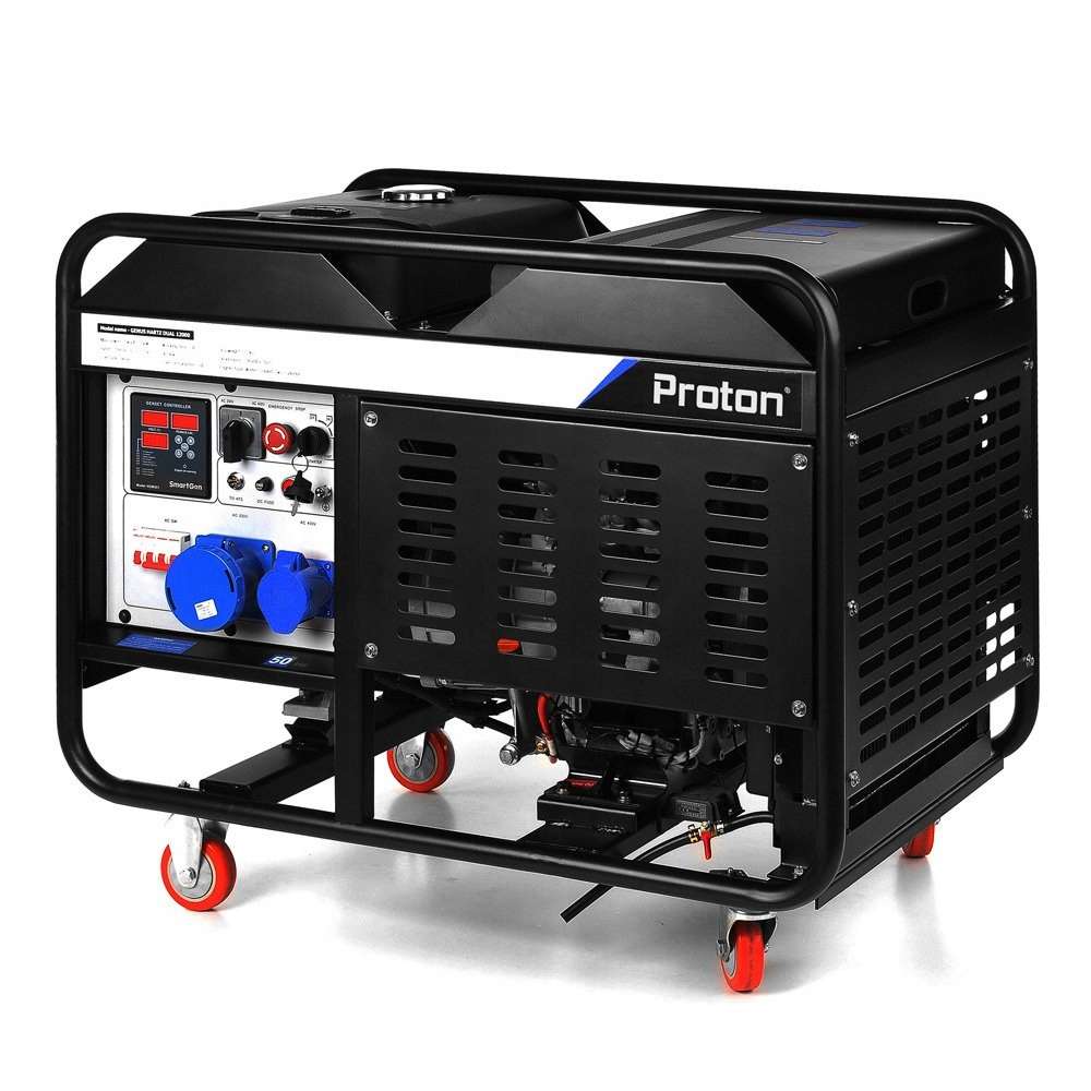 Model Proton 12000 230V to jednofazowy agregat prądotwórczy o imponującej mocy maksymalnej 12 kW. Jego wyposażenie obejmuje chłodnicę, co pozwala zwiększyć nieprzerwany czas pracy nawet do 24 godzin. Dodatkowo, agregat posiada wbudowany regulator AVR, zapewniający stabilność napięcia.