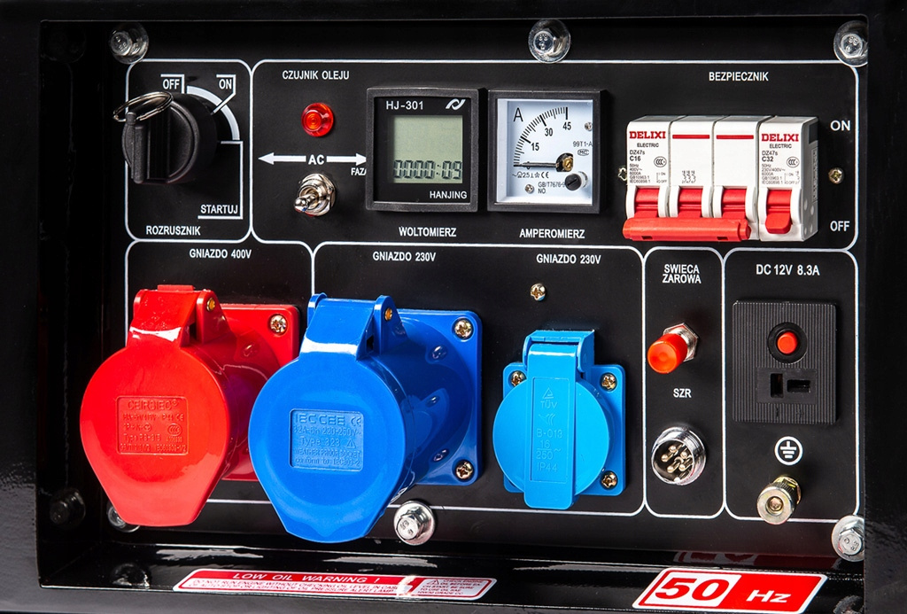 - Trzy wyjścia napięcia 400/230/12V (agregat trójfazowy)