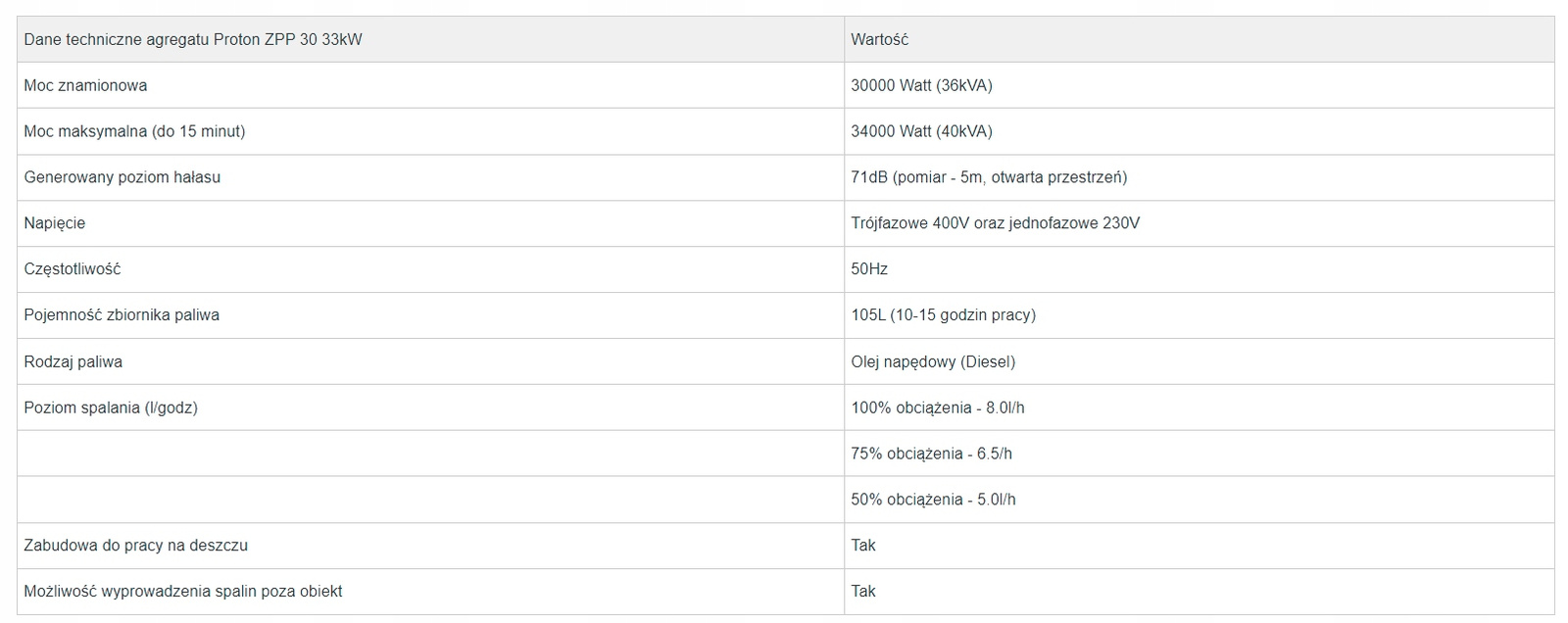 - Poziom spalania (l/godz): 100% obciążenia - 9,5l/h, 75% obciążenia - 7.5l/h, 50% obciążenia - 4,5l/h