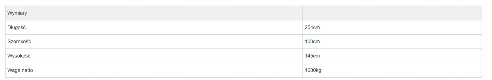 - Wymiary: 225 x 89 x 120 cm, Waga netto: 940kg