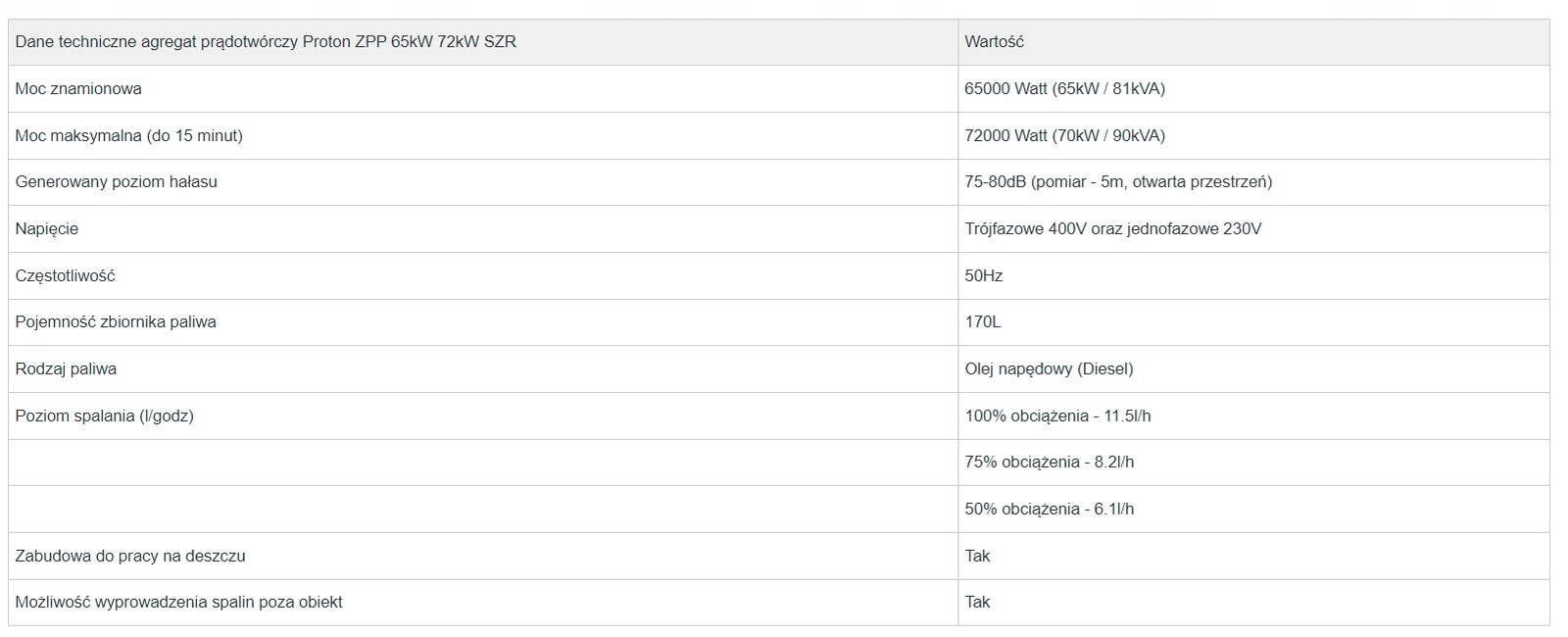 - Moc maksymalna (do 15 minut): 80000 Watt (100kVA)