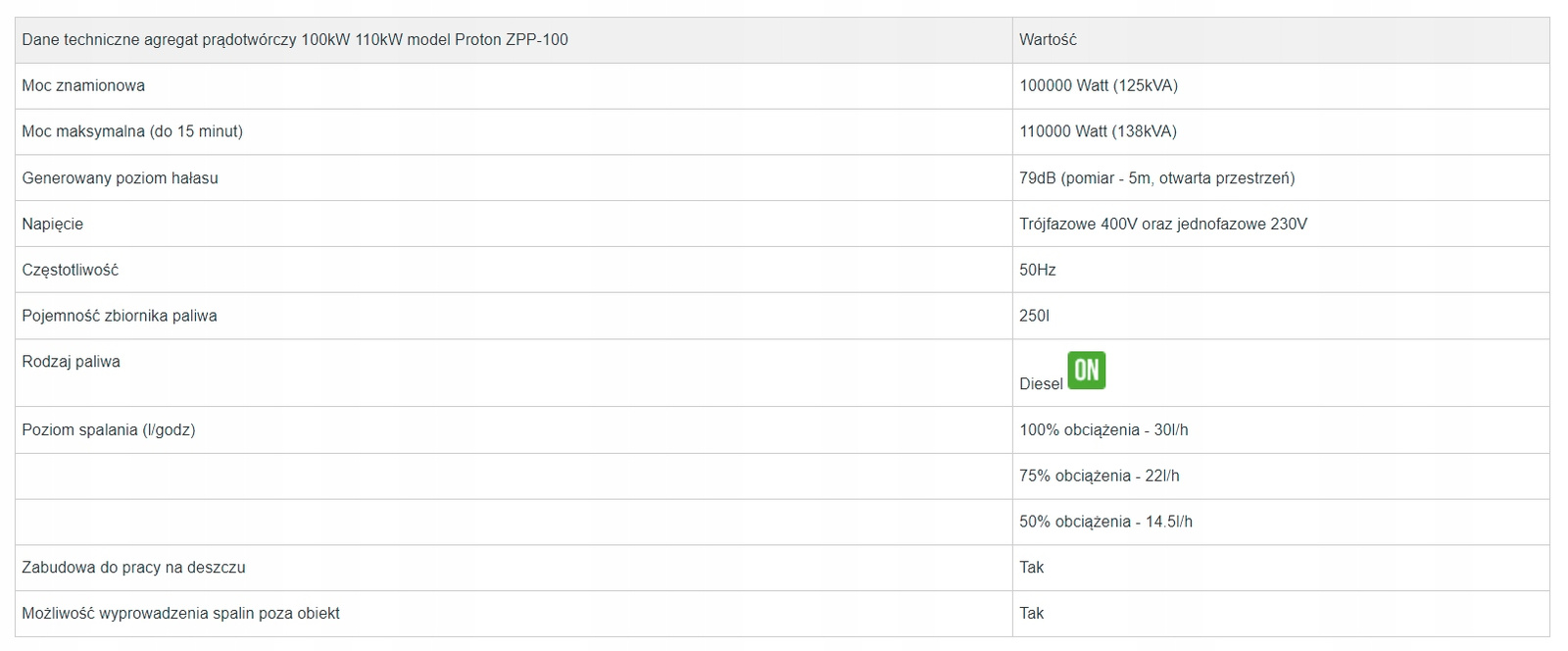 - Moc znamionowa: 125,000 Watt (125kW, 155kVA)