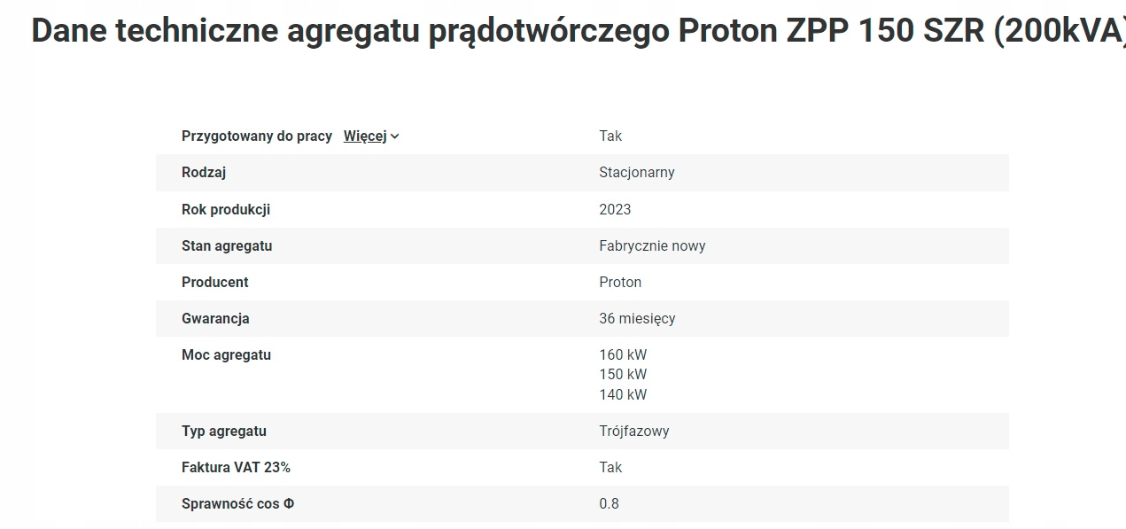 - Moc znamionowa: 150000 Watt (150kW, 188kVA)